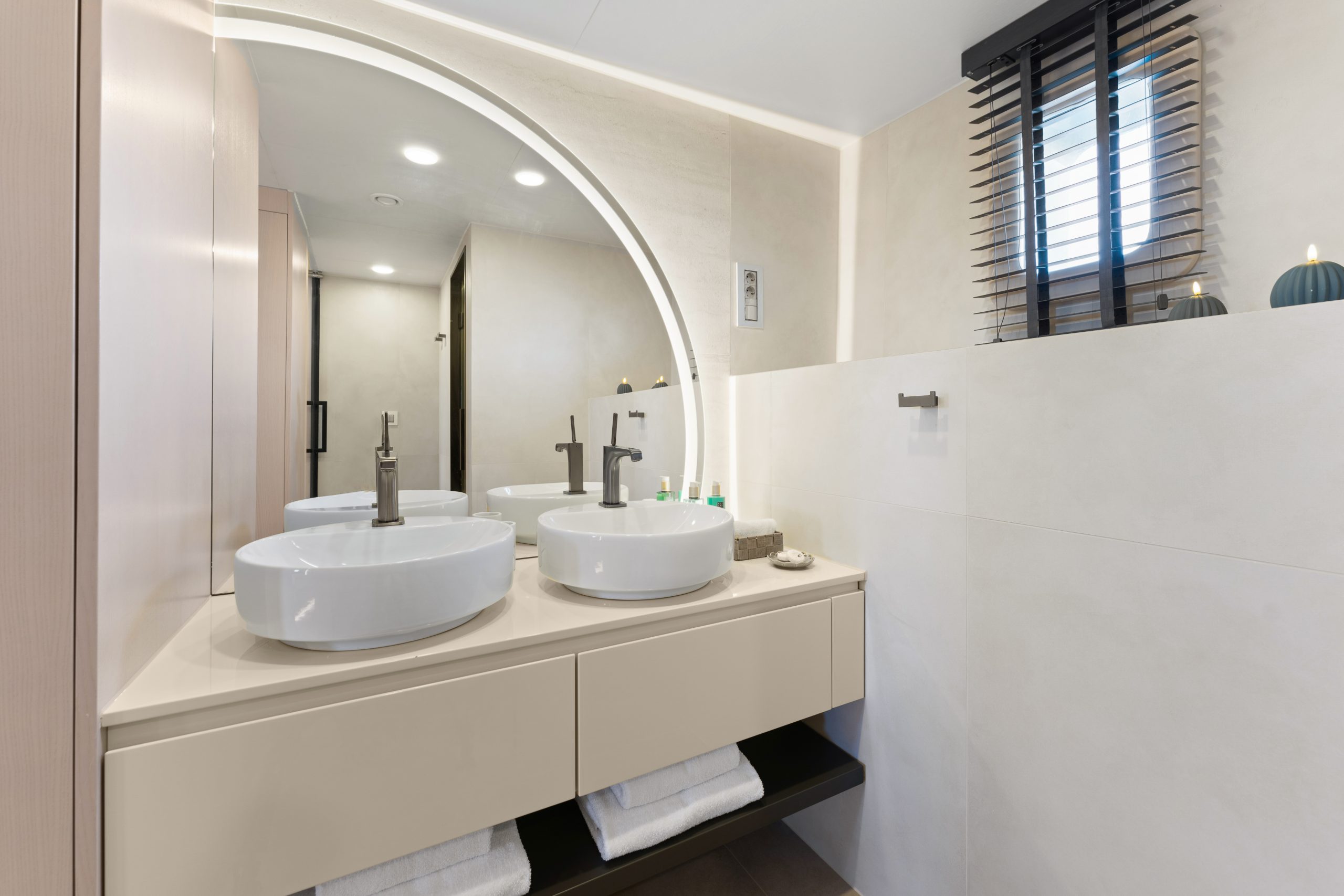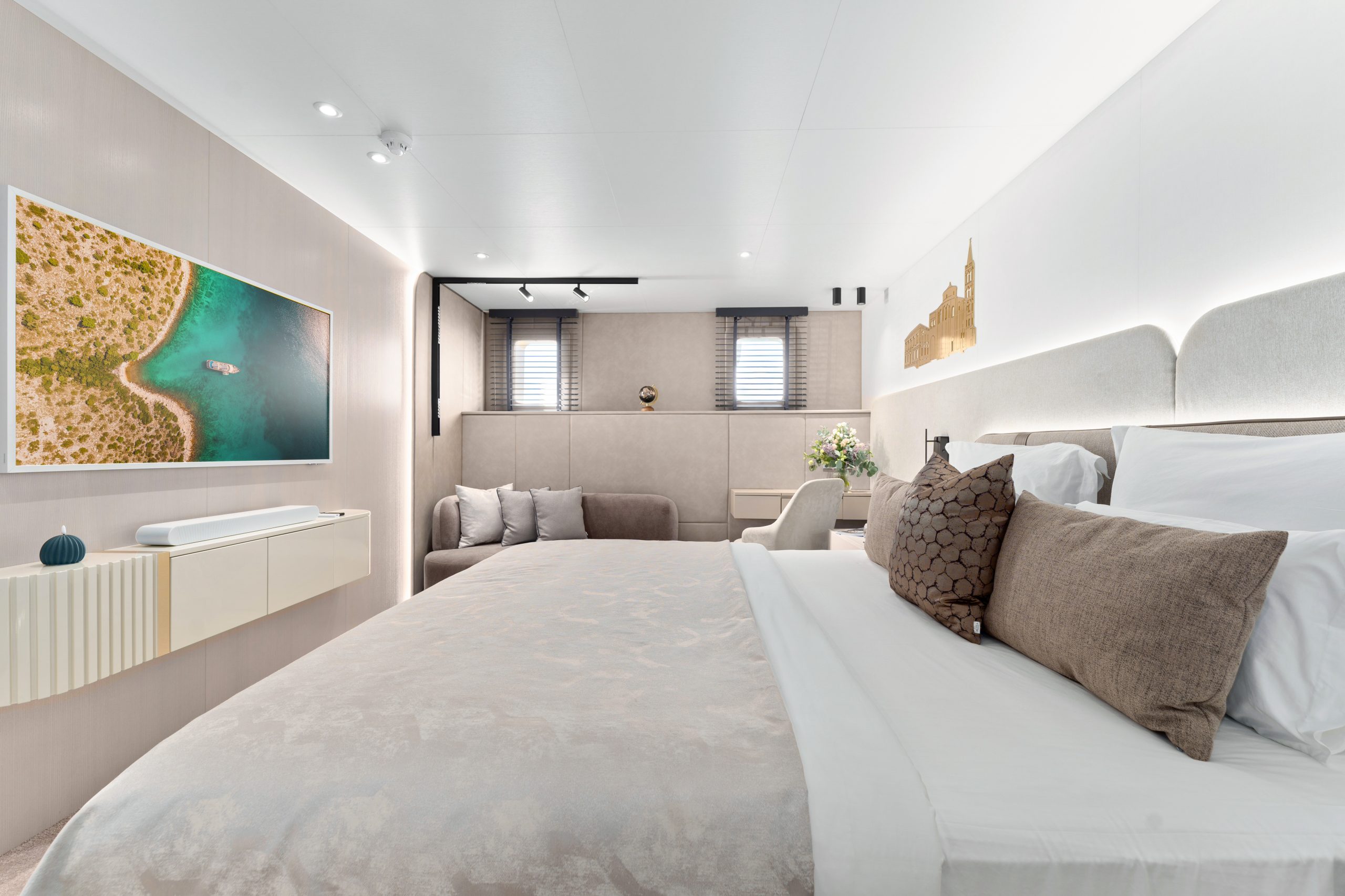 Maxita offers six elegant cabins, each designed for comfort, privacy and a sense of calm. The master and VIP suites feature spacious double beds and private bathrooms, while the remaining cabins can be arranged as twin or double for added flexibility. Wherever you stay, you’ll find soft details, quiet luxury and a space to relax in your own way.